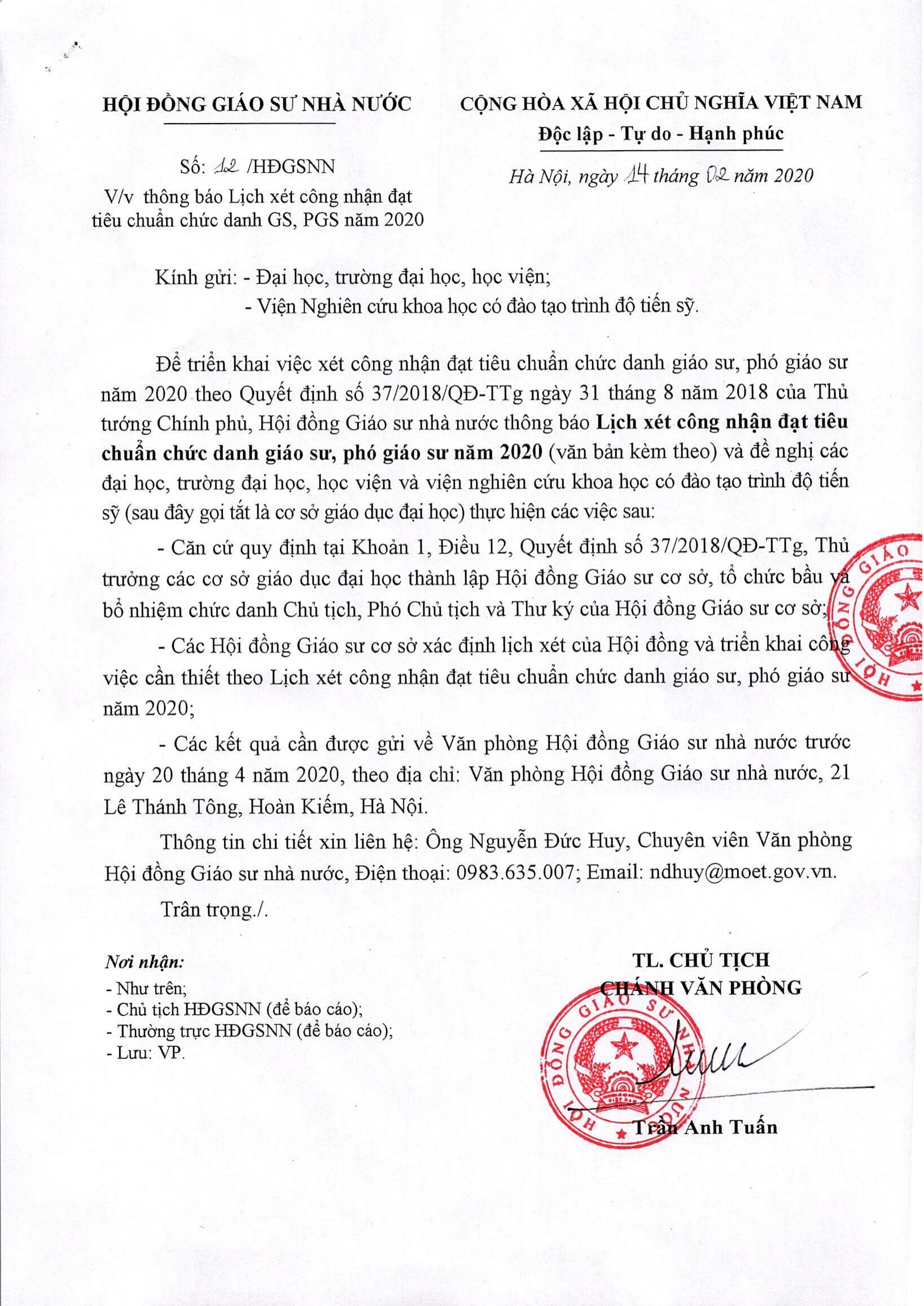 Trường Đại học Giáo dục thông báo Công văn số 12/HĐGSNN ngày 14 tháng 02 năm 2020 của Hội đồng Giáo sư Nhà nước về việc Thông báo Lịch xét công nhận đạt tiêu chuẩn chức danh GS, PGS năm 2020.