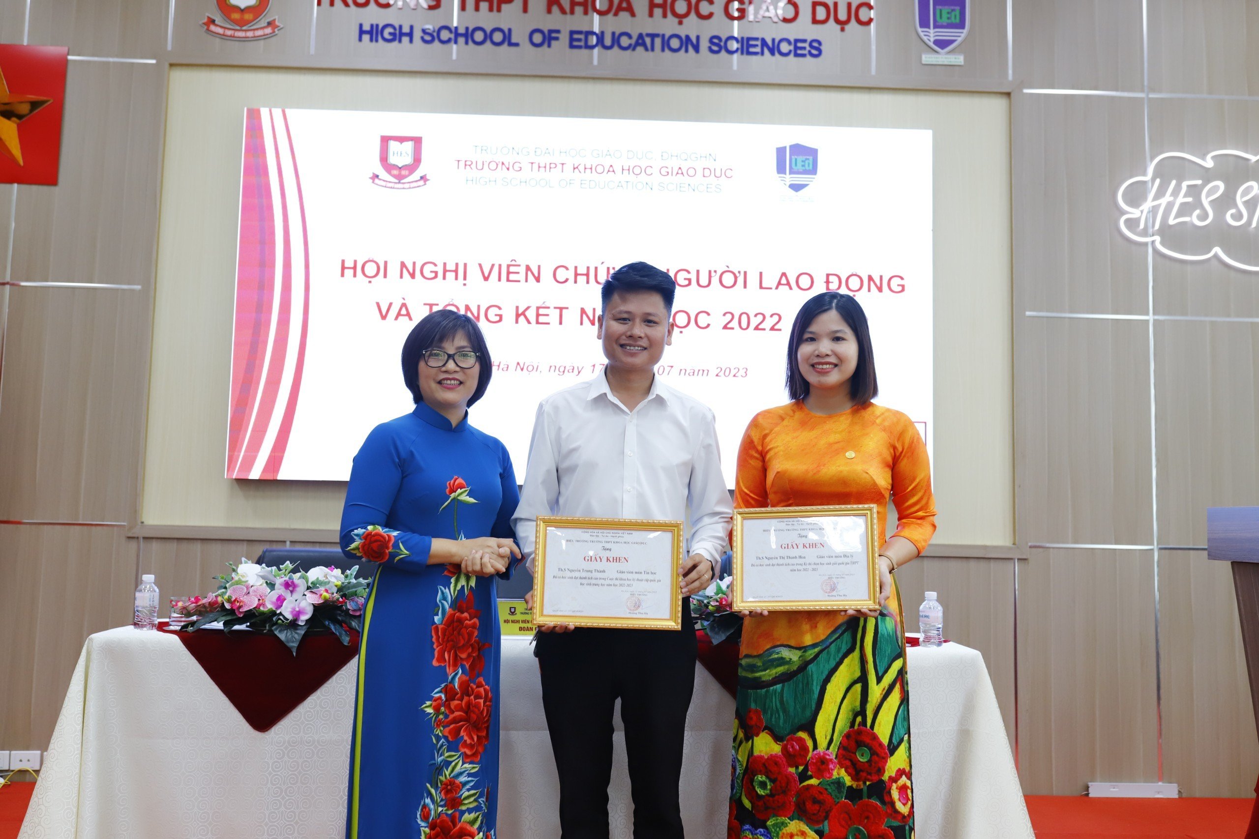 Tại Hội nghị Trường THPT Khoa học Giáo dục, Chủ tịch Hội đồng Trường THPT Khoa học Giáo dục PGS.TS. Nguyễn Thị Hương trao giấy khen cho các cán bộ, giáo viên.