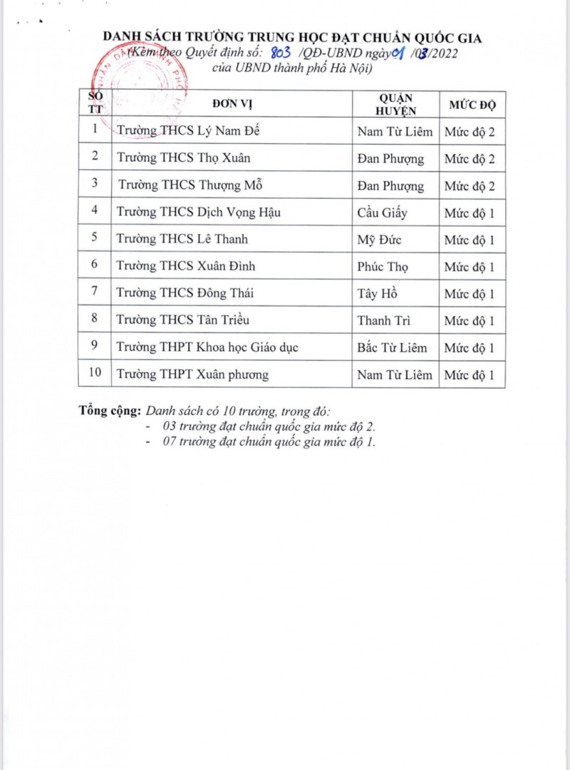 Quyết định này công nhận này gồm có: 08 trường trung học cơ sở và 02 trường trung học phổ thông đạt chuẩn quốc gia. Trong đó, có 3 trường trung học cơ sở đạt chuẩn quốc gia mức độ 2 và 5 trường trung học cơ sở đạt chuẩn mức độ 1 và 2 trường trung học phổ thông đạt chuẩn mức độ 1.