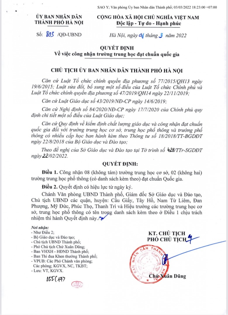 Trường THPT Khoa học Giáo dục, thuộc Trường ĐH Giáo dục, ĐHQGHN là một trong hai trường trung học phổ thông được công nhận đạt chuẩn quốc gia, mức độ 1, cùng với Trường THPT Xuân Phương (quận Nam Từ Liêm).