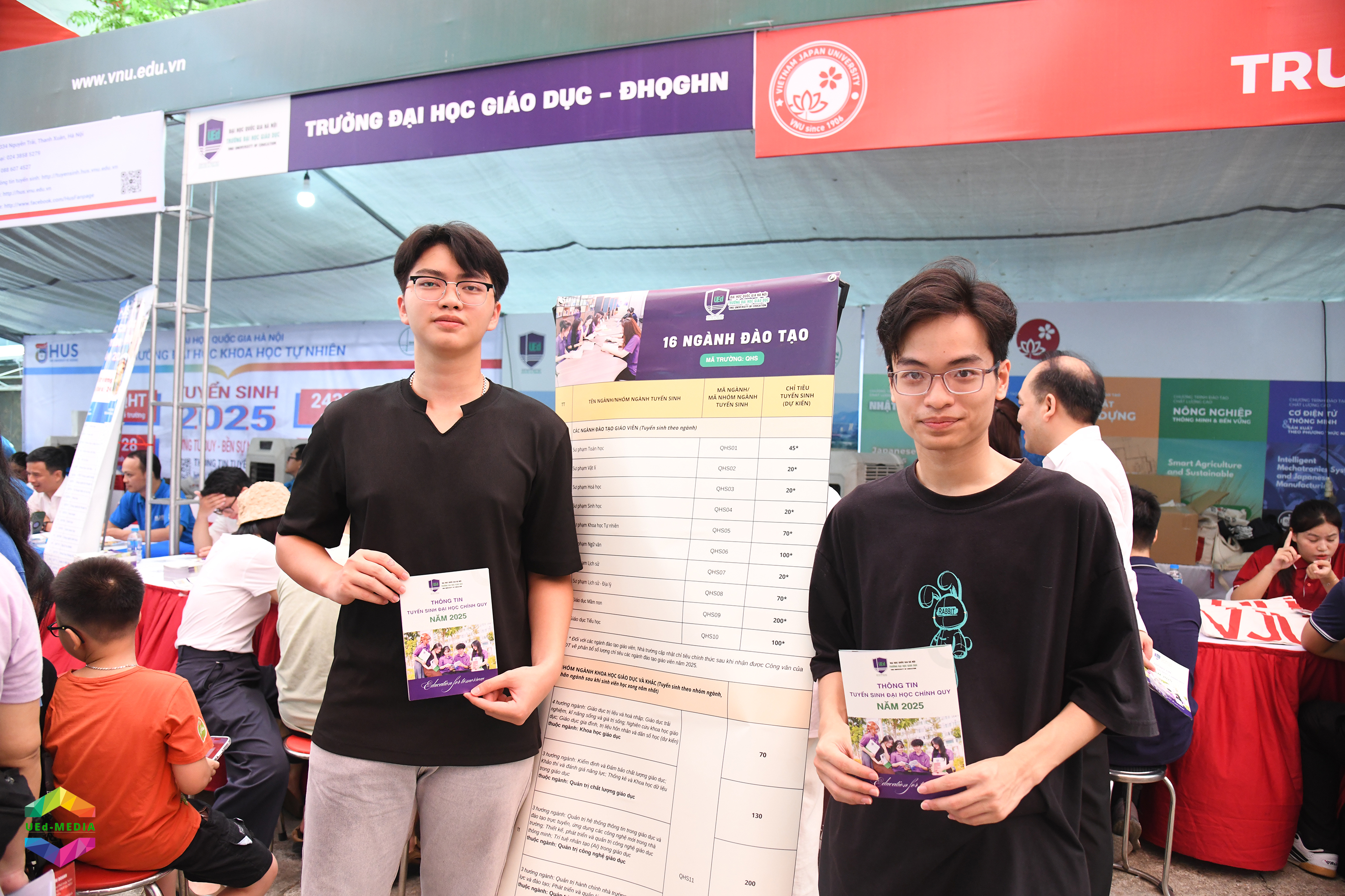 Đôi bạn thân Nguyễn Tiến Long An và Nguyễn Xuân Hưng đến từ Trường THPT Việt Yên số 1 – Bắc Ninh chia sẻ: “Chúng em đến đây từ sớm để tránh nắng nóng và mong nhận được chia sẻ của các thầy cô về các ngành học của trường mình. Em rất ấn tượng với sự nhiệt tình, gần gũi và cởi mở của các thầy cô khi giải đáp từng thắc mắc của chúng em. Em hy vọng trong tương lai sẽ có cơ hội trở thành sinh viên của Trường Đại học Giáo dục.”