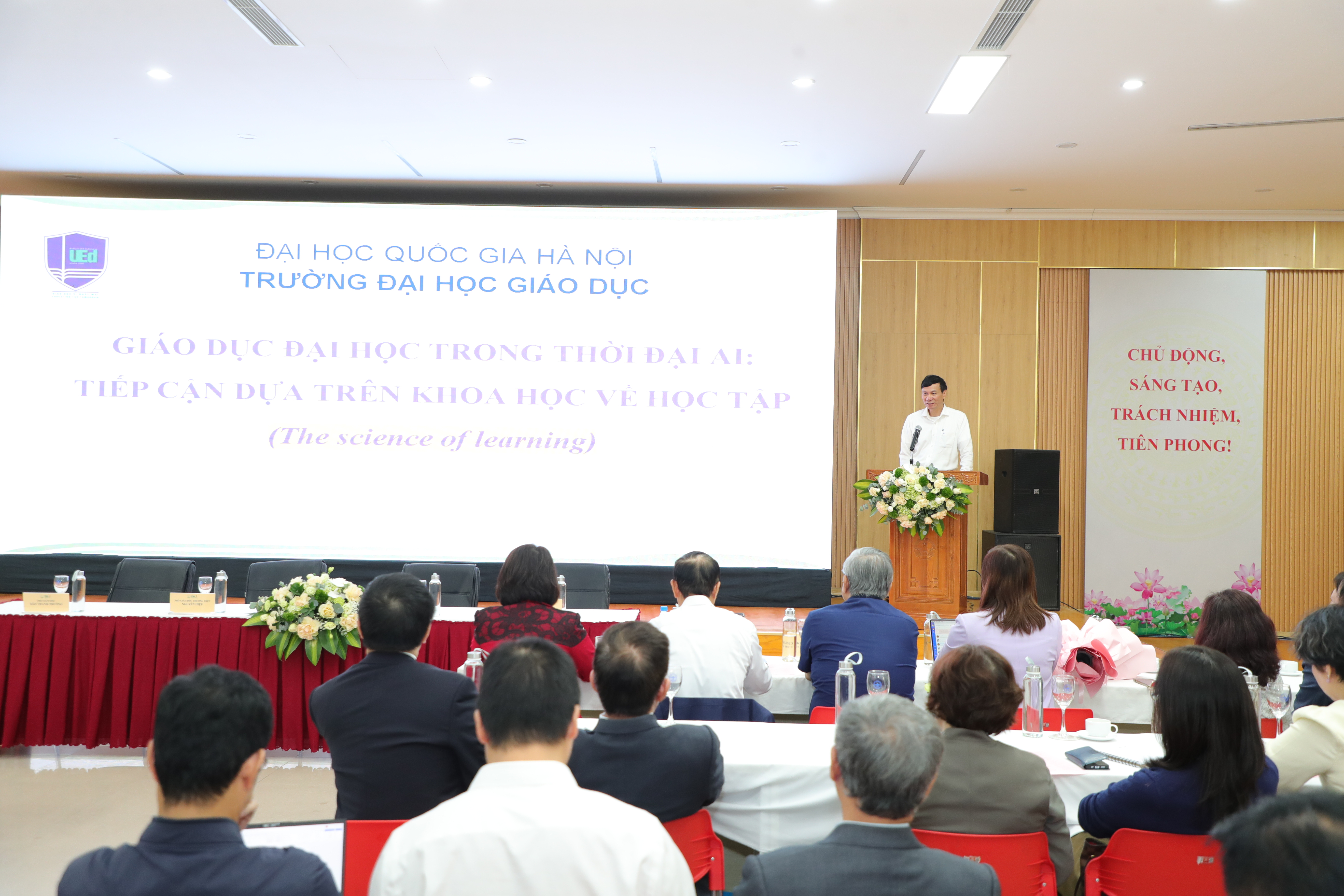 Trong khuôn khổ Hội nghị, Hiệu trưởng Trường Đại học Giáo dục GS.TS. Nguyễn Quý Thanh đã trình bày tham luận với chủ đề “Giáo dục đại học trong thời đại AI: Tiếp cận dựa trên Khoa học về học tập (The Science of Learning)”, mang đến một góc nhìn khoa học và thực tiễn sâu sắc về cách AI đang – và nên – được ứng dụng trong giáo dục. Theo đó, AI được nhìn nhận không phải như “người thay thế tri thức” mà là công cụ hỗ trợ tư duy và thực hành học tập, giúp kích hoạt những tiến trình nhận thức ở bậc cao hơn. Và để ứng dụng AI một cách hiệu quả, nghiên cứu về giáo dục cần tiếp cận nó trên nền tảng của khoa học về học tập; các thành tựu của khoa học nhận thức, tâm lý học và thần kinh ứng dụng để đưa ra những khuyến nghị. Đây cũng chính là những hướng nghiên cứu mà Trường Đại học Giáo dục đang tiên phong nghiên cứu.