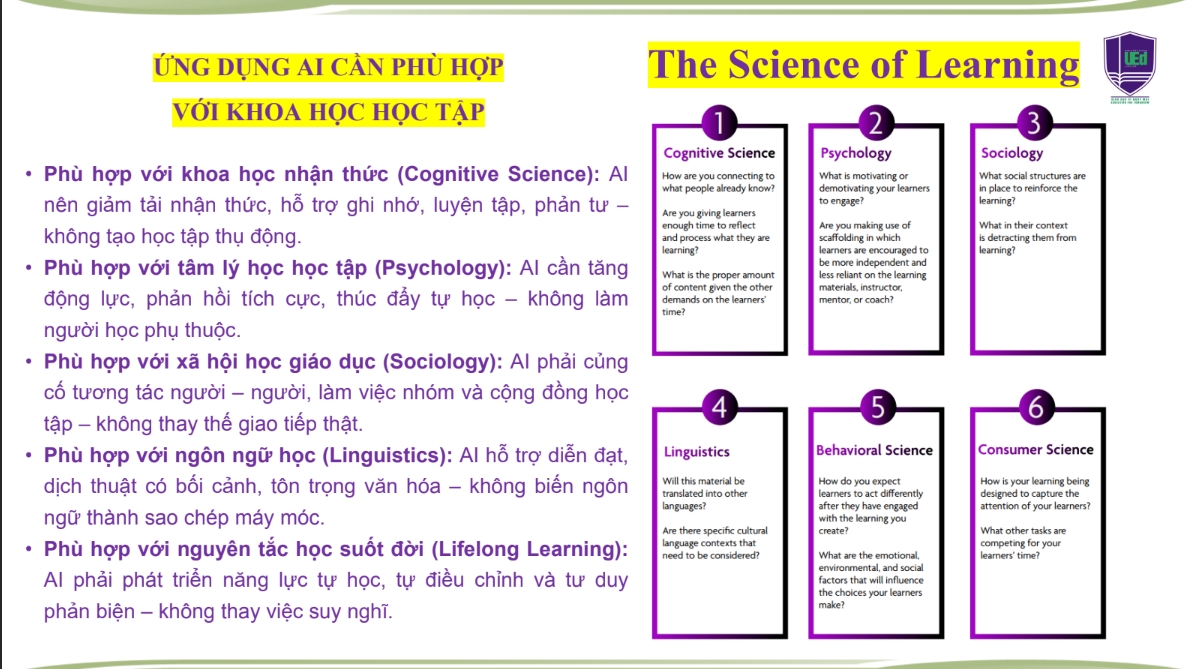 Chính vì vậy, AI chỉ có ý nghĩa khi được đặt trên nền tảng của khoa học học tập – Science of Learning, bao gồm ba trụ cột: Khoa học nhận thức, Tâm lý học học tập, và Khoa học thần kinh giáo dục.