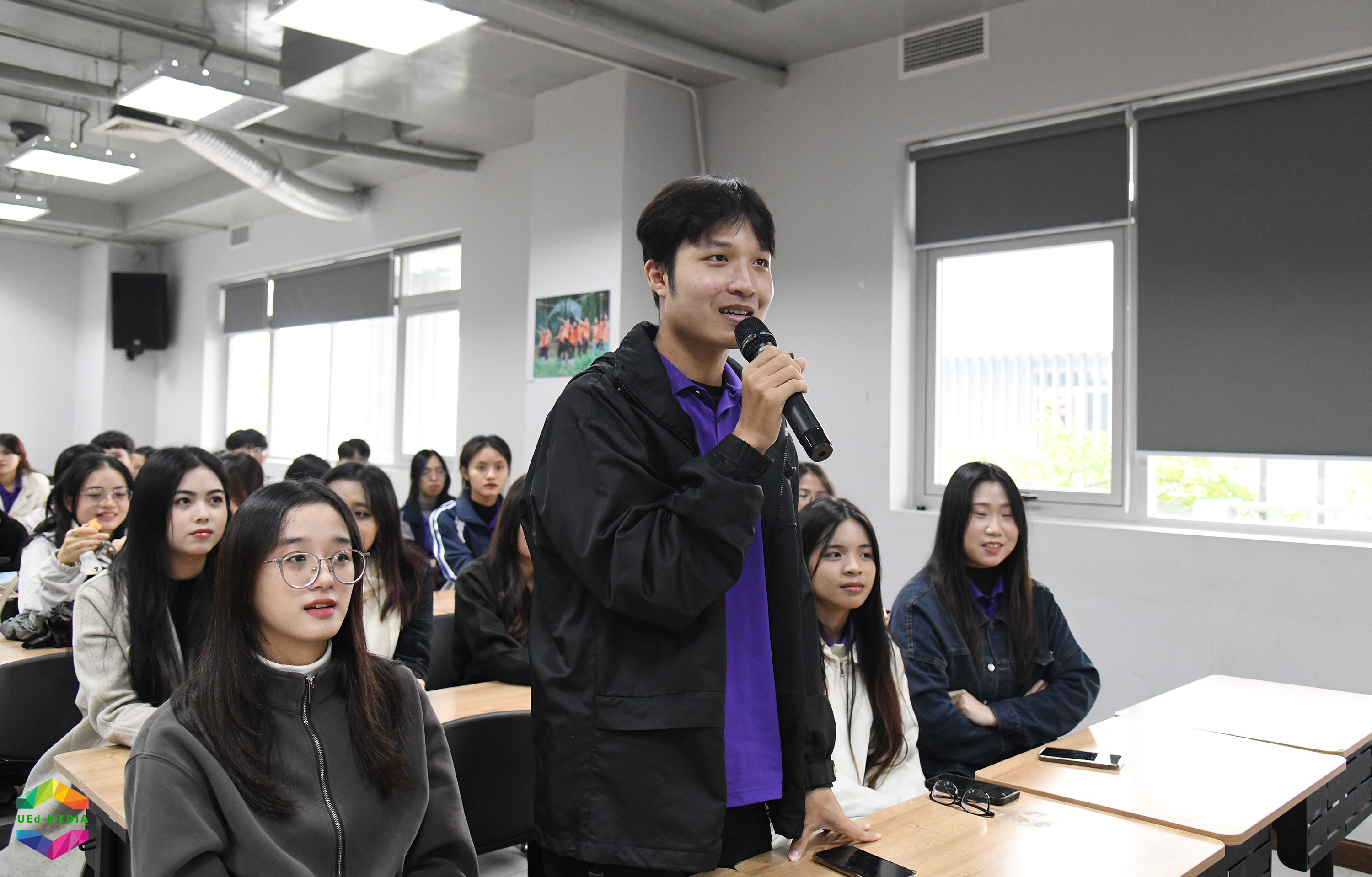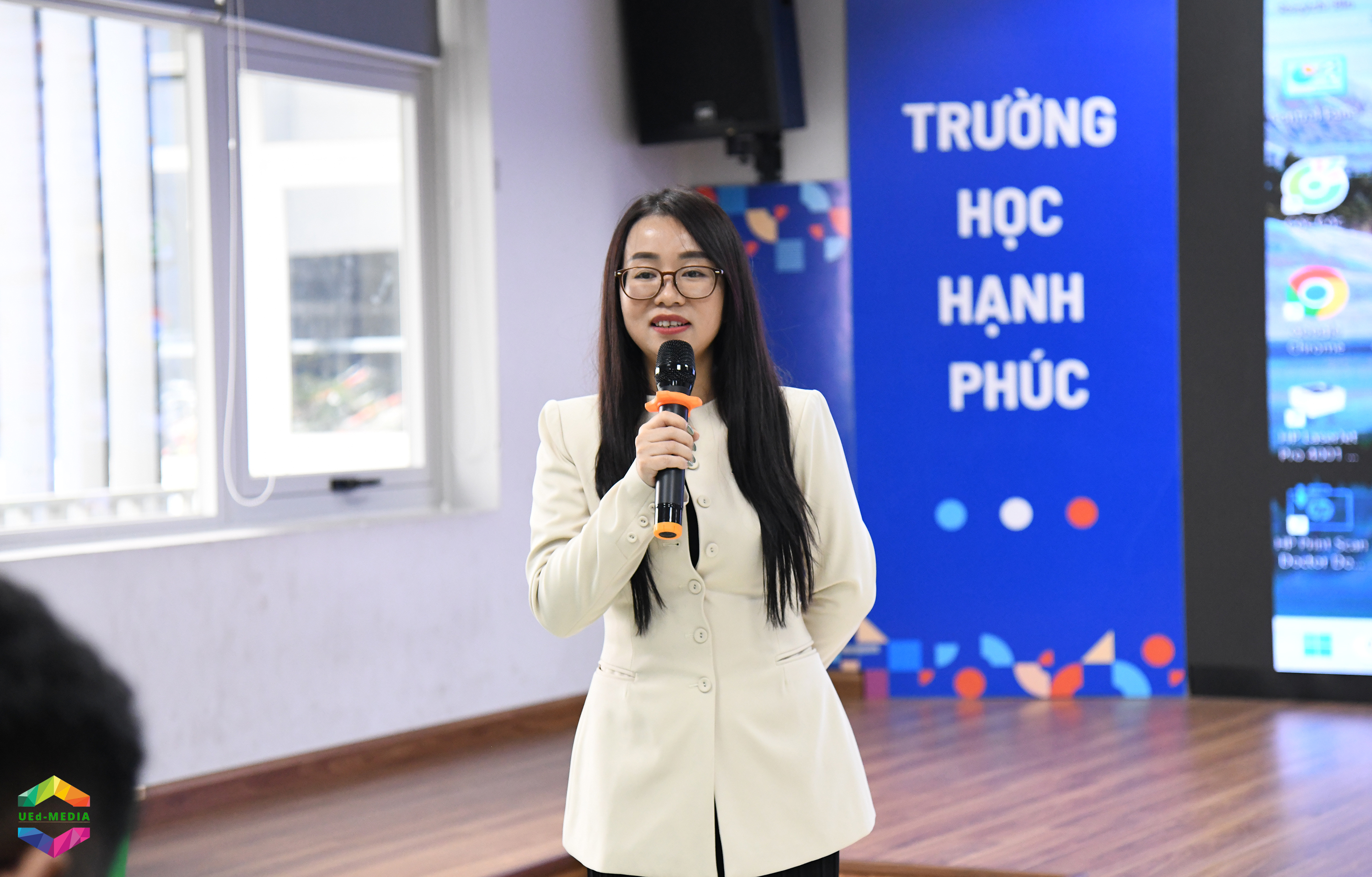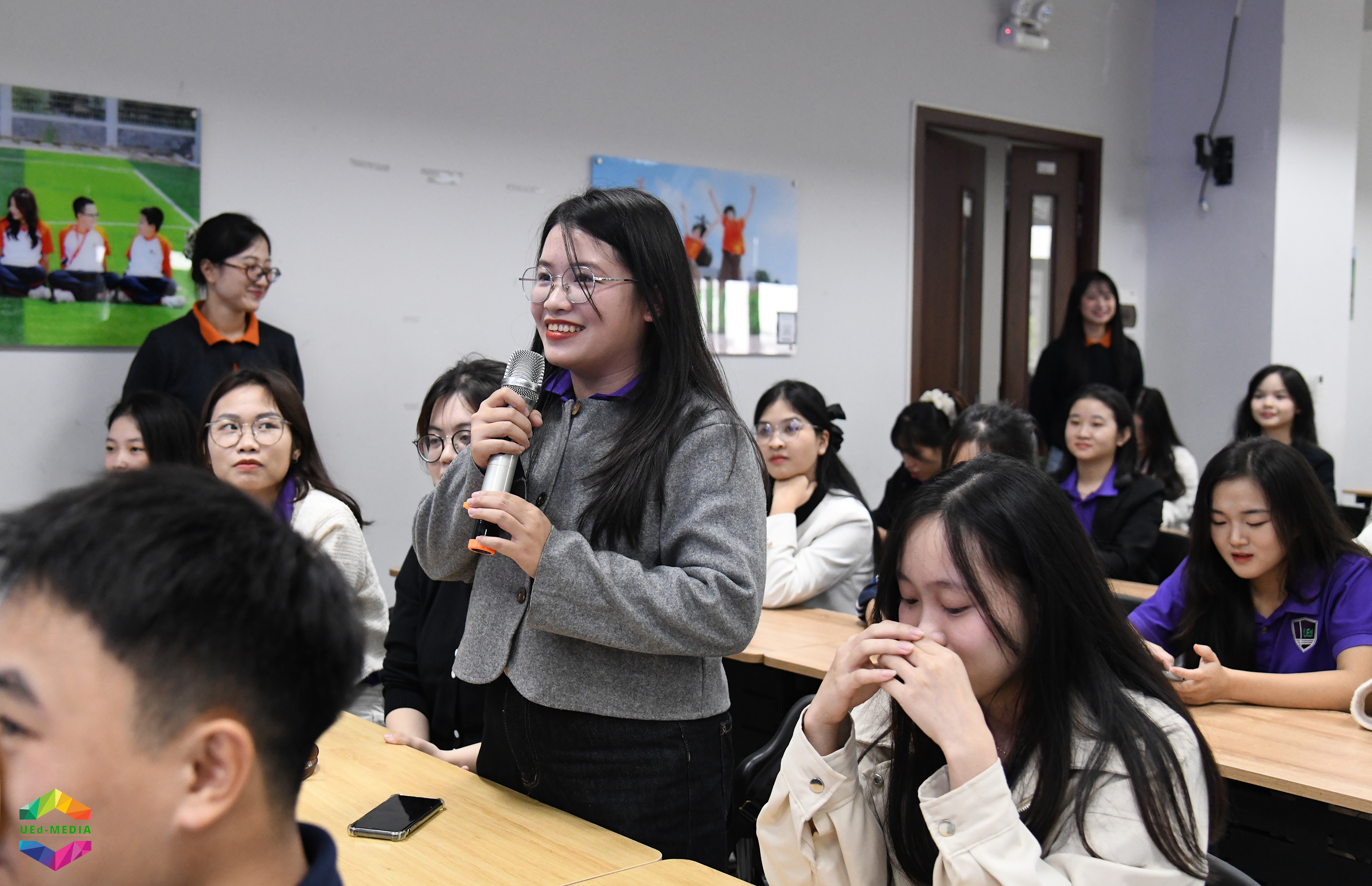 Bên cạnh đó, cô Lê Thanh Ngân – Trưởng phòng tuyển dụng – Khối giáo dục FPT đã có phần chia sẻ gần gũi và truyền cảm hứng về hành trình xây dựng môi trường học tập hiện đại tại hệ thống Fschool, cũng như triết lý “học tập hạnh phúc”, nơi người thầy trở thành người đồng hành, khơi dậy cảm hứng và giúp học sinh phát triển toàn diện. Từ kinh nghiệm thực tế trong giảng dạy và tổ chức hoạt động học tập, cô mang đến cho sinh viên Trường Đại học Giáo dục nhiều góc nhìn mới mẻ về nghề, đồng thời mở ra cơ hội để các bạn hiểu hơn về quy trình tuyển dụng và phát triển nghề nghiệp trong môi trường giáo dục FPT – một môi trường năng động, sáng tạo và đề cao giá trị con người.