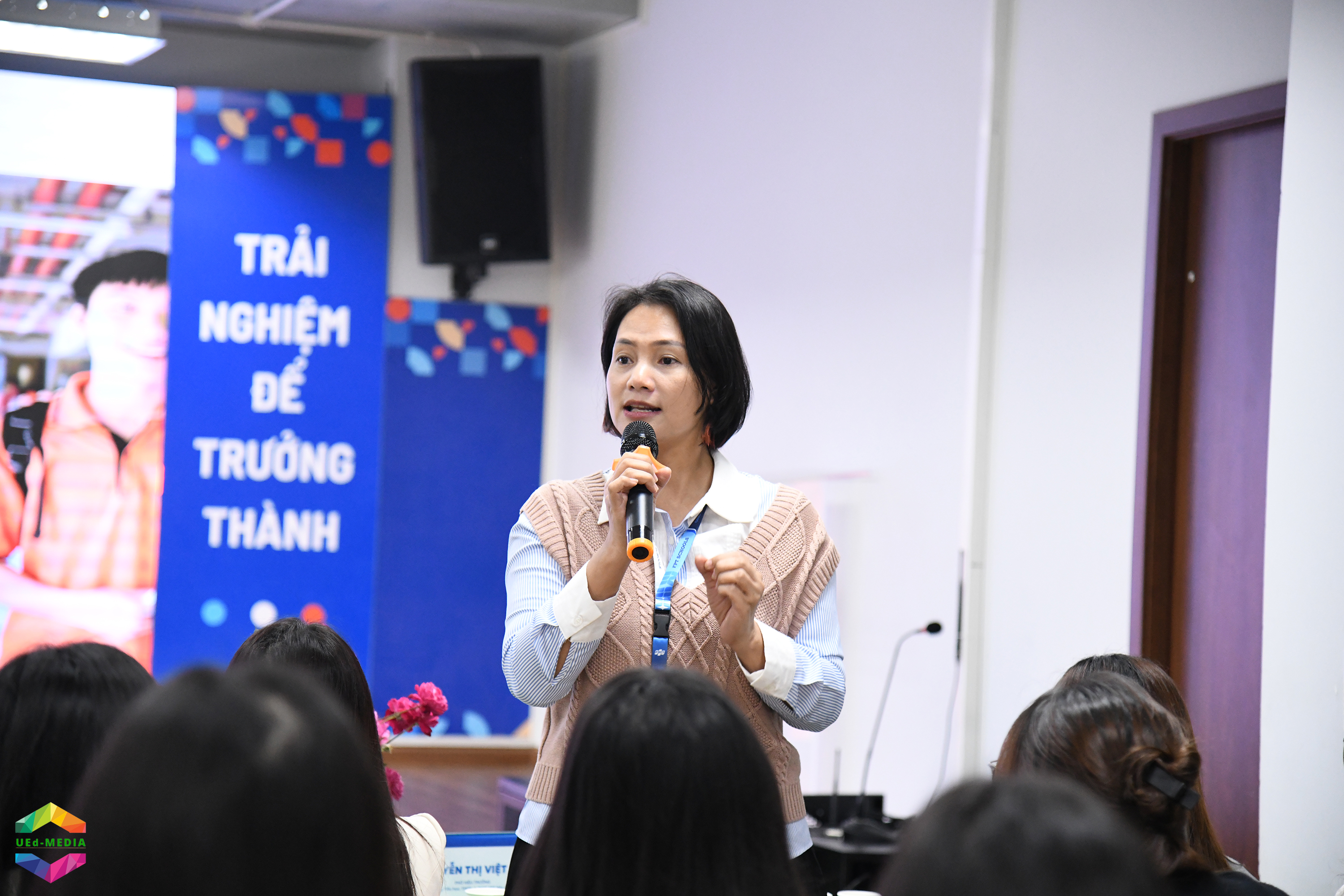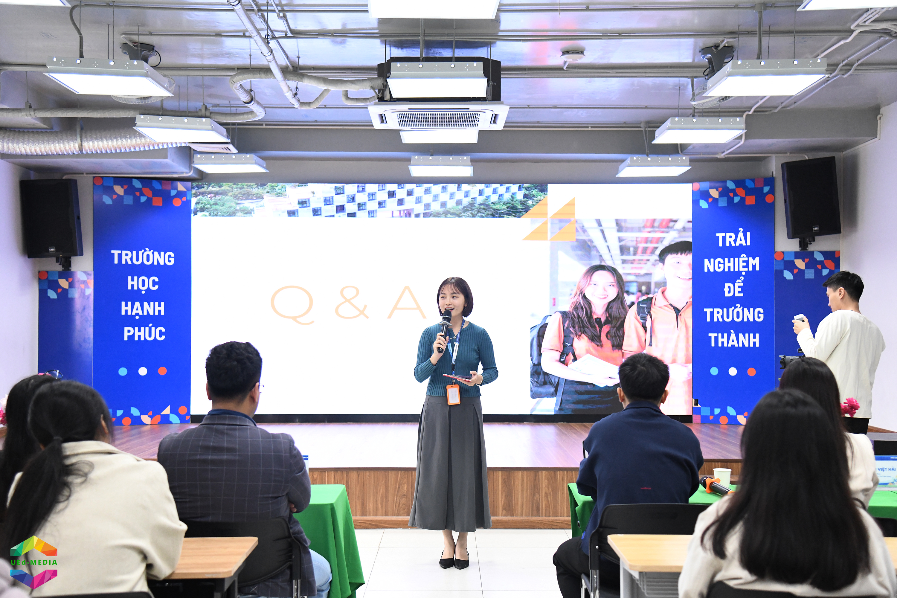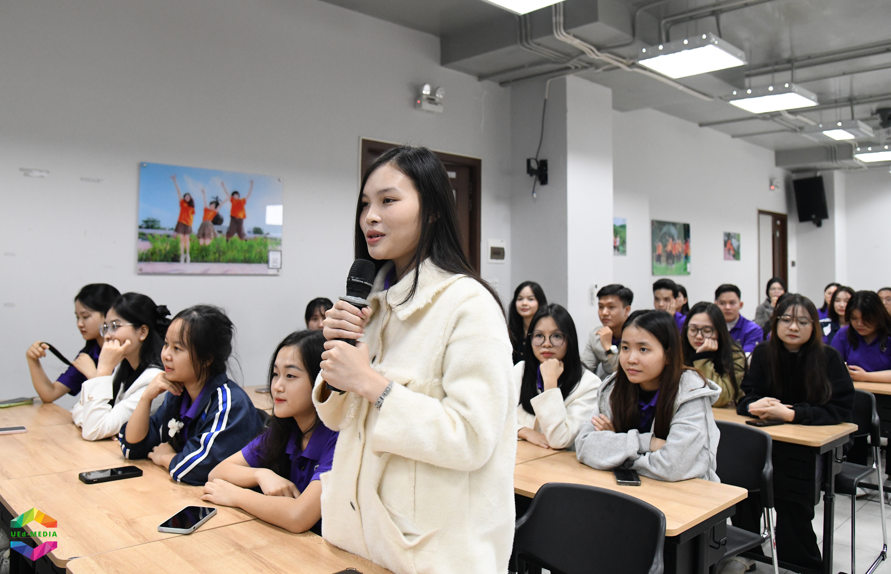 Bên cạnh đó, cô Lê Thanh Ngân – Trưởng phòng tuyển dụng – Khối giáo dục FPT đã có phần chia sẻ gần gũi và truyền cảm hứng về hành trình xây dựng môi trường học tập hiện đại tại hệ thống Fschool, cũng như triết lý “học tập hạnh phúc”, nơi người thầy trở thành người đồng hành, khơi dậy cảm hứng và giúp học sinh phát triển toàn diện. Từ kinh nghiệm thực tế trong giảng dạy và tổ chức hoạt động học tập, cô mang đến cho sinh viên Trường Đại học Giáo dục nhiều góc nhìn mới mẻ về nghề, đồng thời mở ra cơ hội để các bạn hiểu hơn về quy trình tuyển dụng và phát triển nghề nghiệp trong môi trường giáo dục FPT – một môi trường năng động, sáng tạo và đề cao giá trị con người.