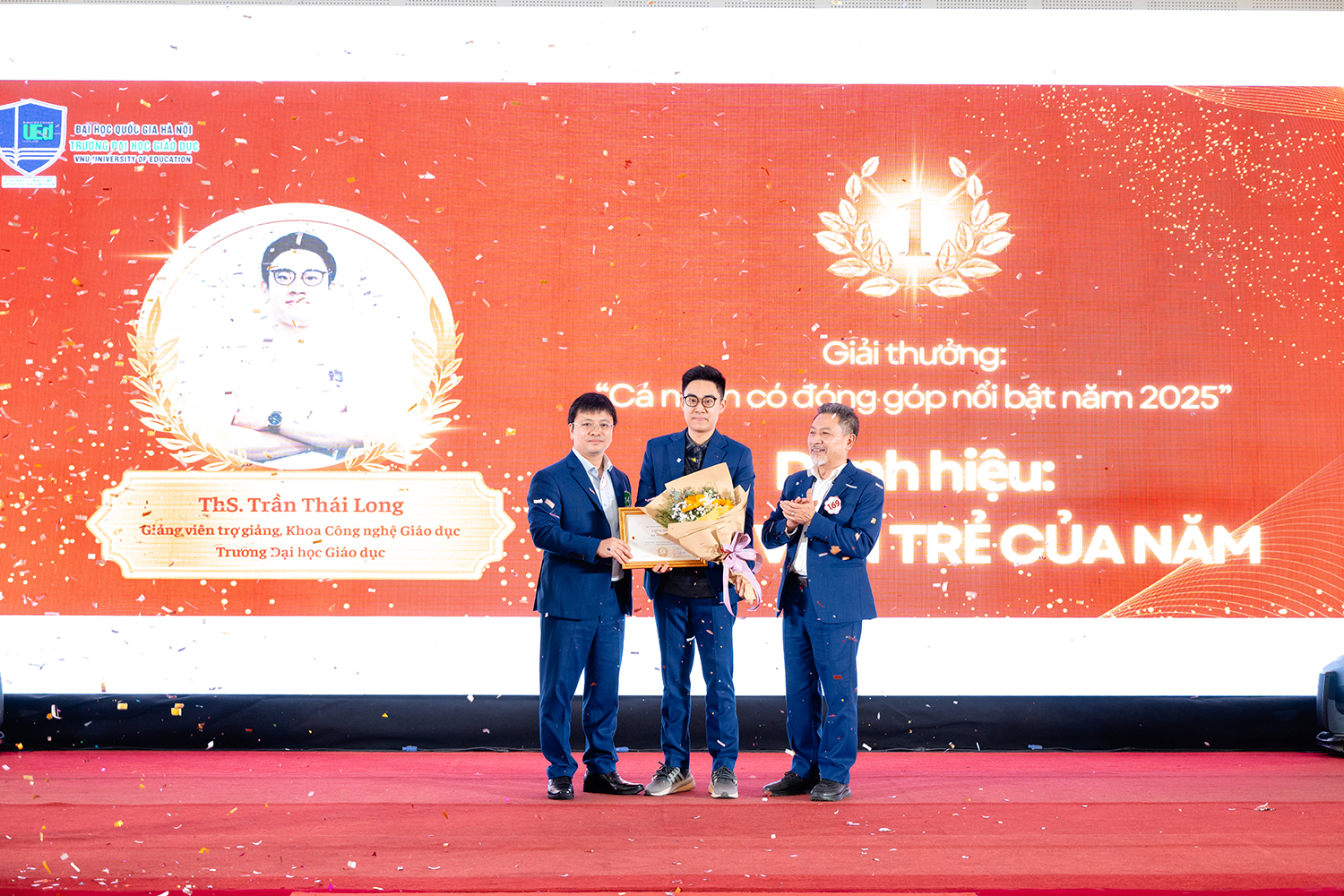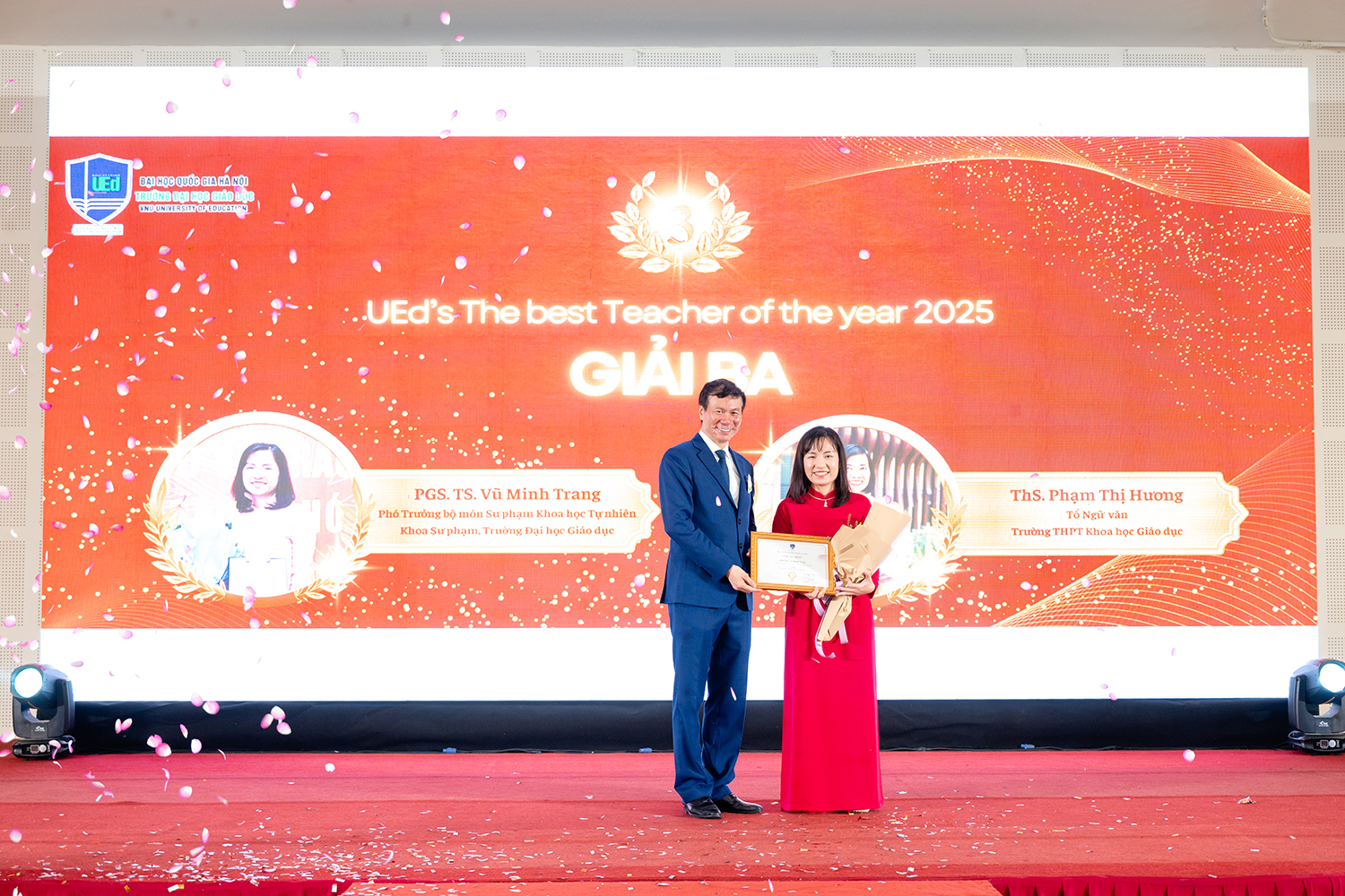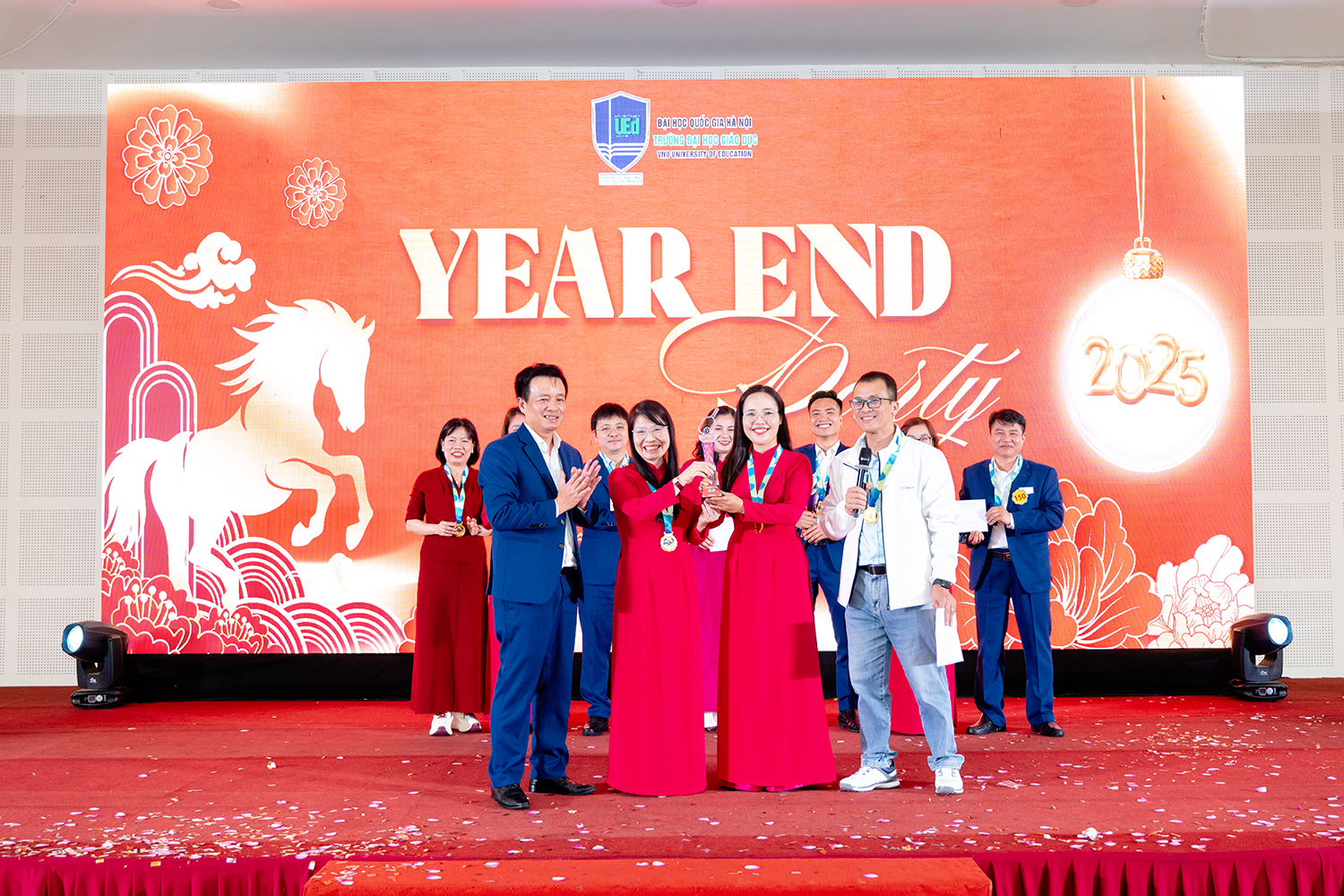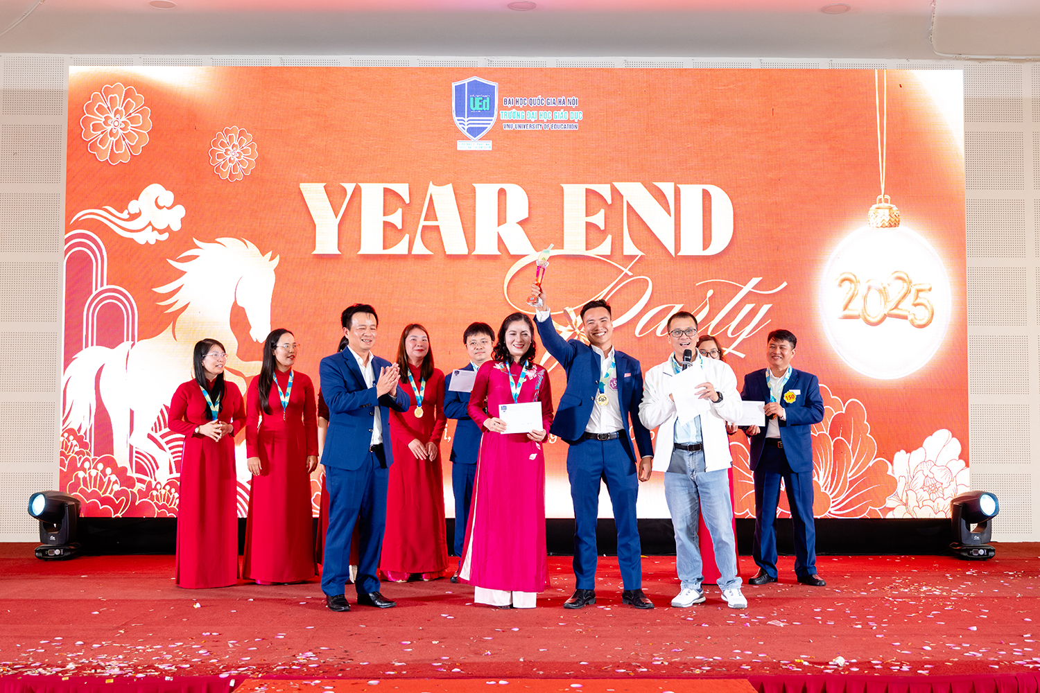 Trong khuôn khổ của buổi Year End Party, Trường Đại học Giáo dục đã vinh danh các giảng viên, giáo viên đạt danh hiệu “UEd The best Teacher of the year 2025”, đồng thời vinh danh các cá nhân có đóng góp nổi bật năm 2025. Những danh hiệu này vừa là sự ghi nhận và biểu dương những đóng góp tích cực trong công tác giảng dạy, nghiên cứu và xây dựng Nhà trường, đồng thời còn góp phần khơi dậy tinh thần trách nhiệm, tạo động lực để đội ngũ tiếp tục đồng hành, cống hiến cho sự phát triển chung của Trường Đại học Giáo dục.