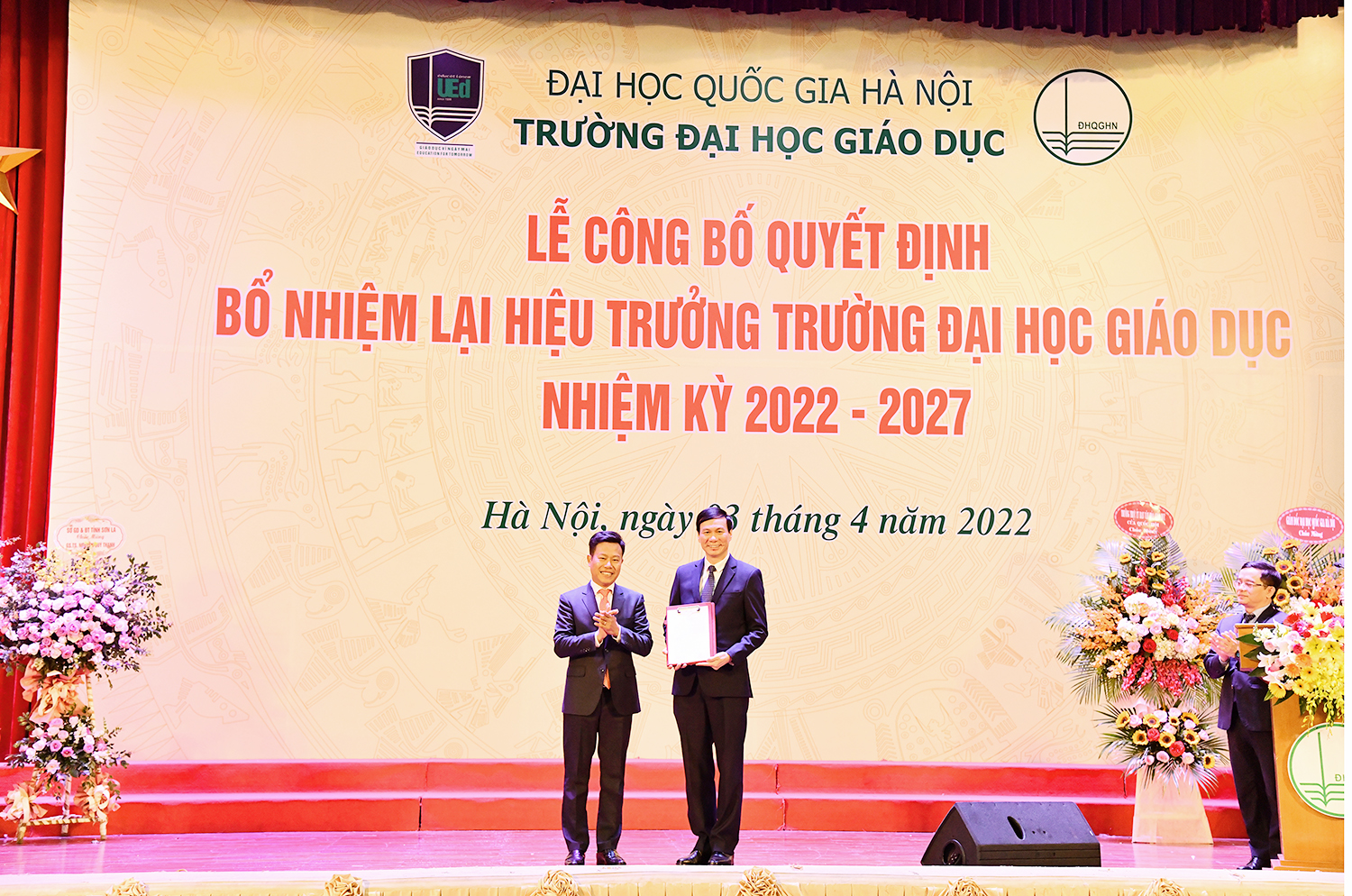 Phát biểu tại buổi Lễ, Giám đốc ĐHQGHN chúc mừng GS.TS. Nguyễn Quý Thanh đã tiếp tục nhận được tín nhiệm của Ban Thường vụ Đảng ủy, Ban Giám đốc ĐHQGHN và sự tin tưởng của toàn thể cán bộ, viên chức của Trường ĐH Giáo dục để tiếp tục giữ trọng trách dẫn dắt Trường ĐH Giáo dục trong nhiệm kỳ mới - nhiệm kỳ 2022-2027.