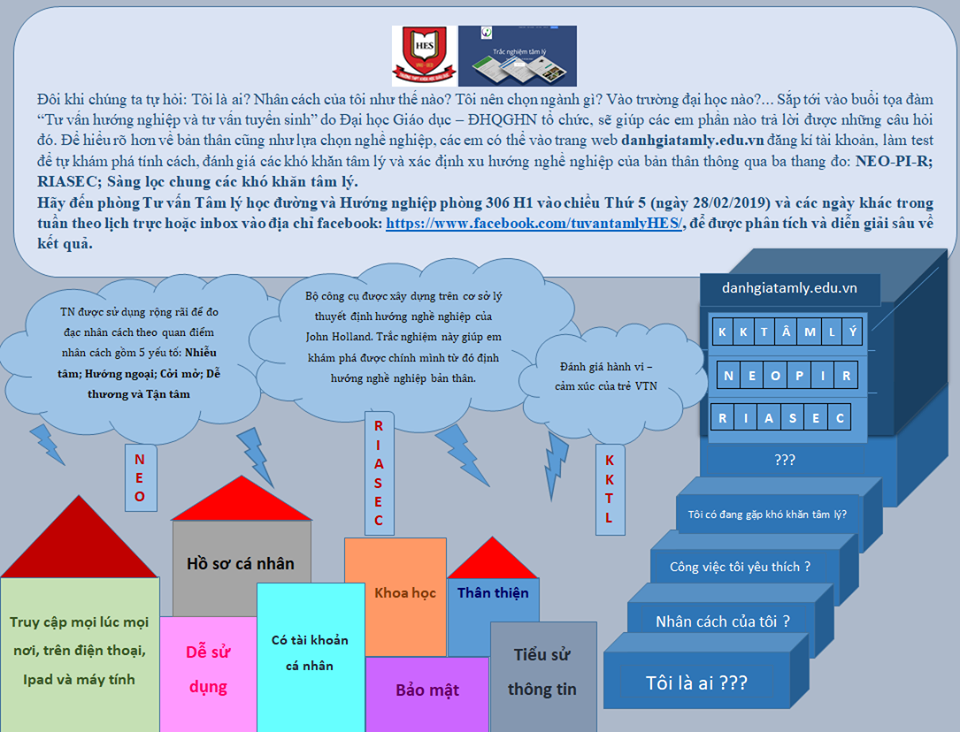 Để hiểu rõ hơn về bản thân cũng như lựa chọn nghề nghiệp, các em có thể vào trang web: http://danhgiatamly.edu.vn/ để đăng kí tài khoản, làm test để tự khám phá tính cách, đánh giá các khó khăn tâm lý và xác định xu hướng nghề nghiệp của bản thân thông qua ba thang đo: NEO-PI-R; RIASEC; Sàng lọc chung các khó khăn tâm lý.