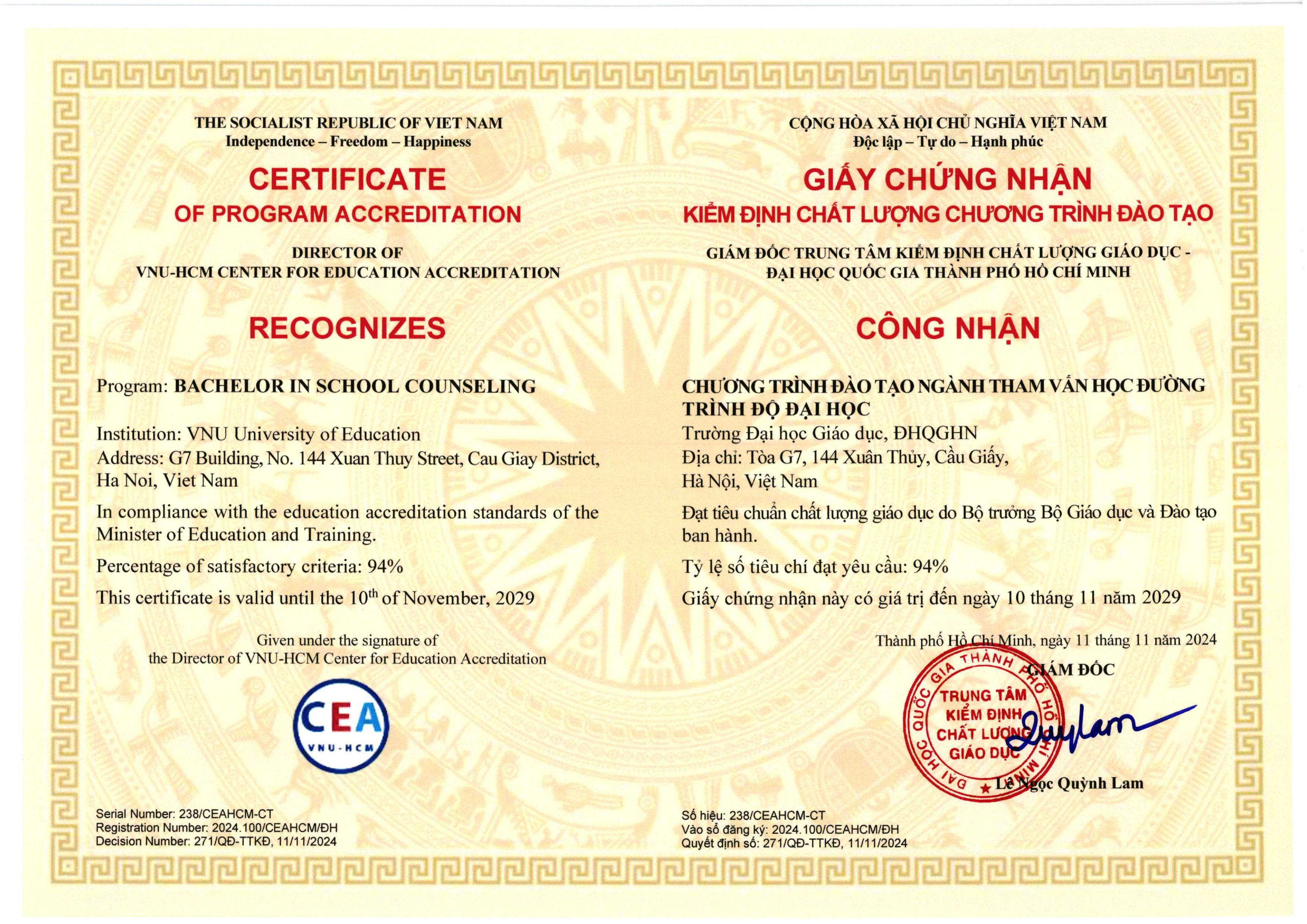 - Chứng nhận Kiểm định chất lượng chương trình đào tạo chuẩn trình độ đại học ngành Sư phạm Ngữ Văn