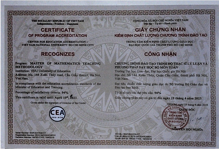 - Chứng nhận Kiểm định chất lượng chương trình đào tạo chuẩn trình độ đại học ngành Sư phạm Toán