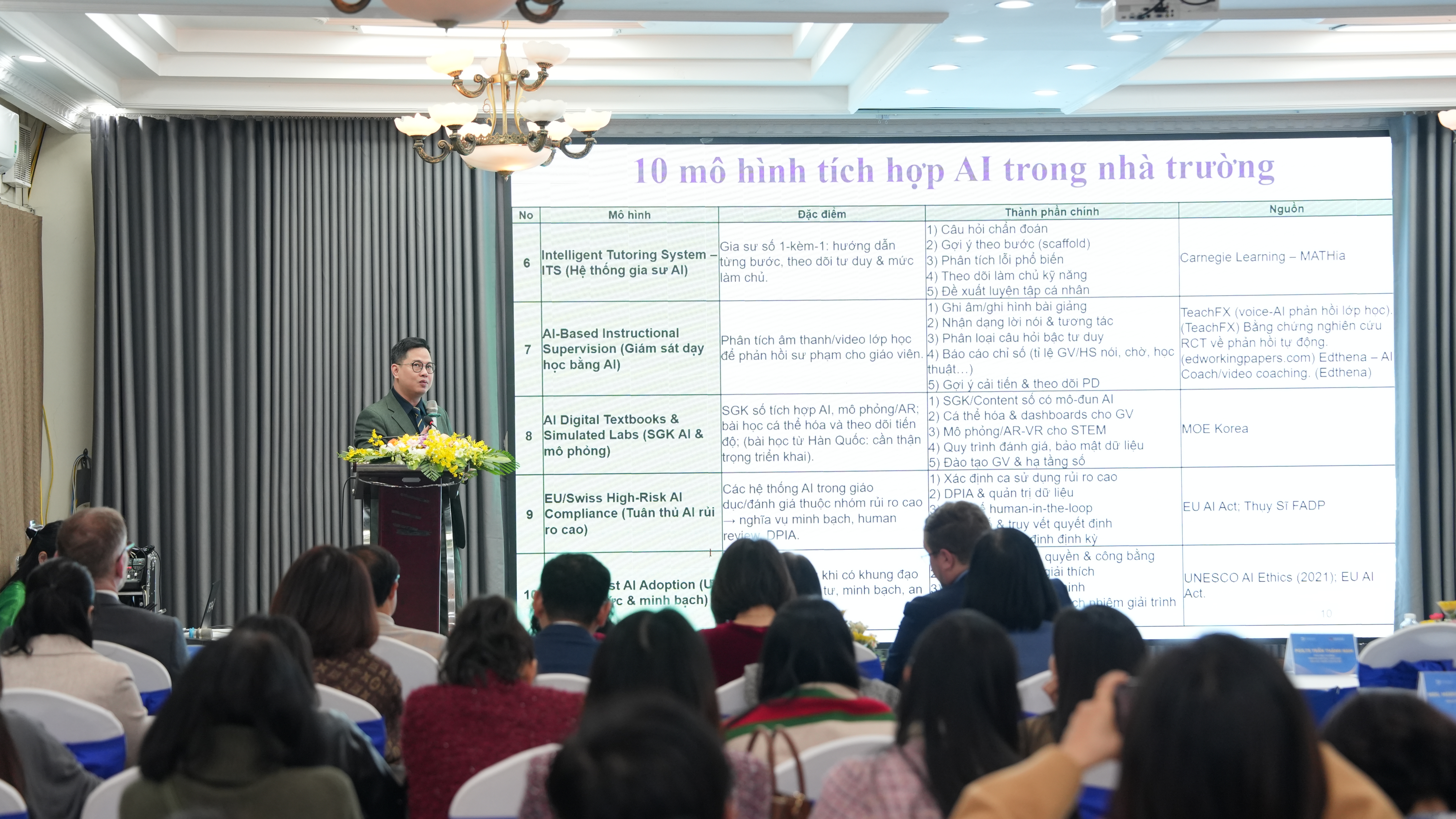 Song song với câu chuyện về con người và niềm tin, hội thảo cũng tiếp cận thận trọng vai trò của trí tuệ nhân tạo trong giáo dục. Các chuyên gia cho rằng AI có thể hỗ trợ hiệu quả cho quản lý và giảng dạy thông qua phân tích dữ liệu học tập, cá nhân hóa lộ trình học hoặc nhận diện sớm rủi ro tâm lý, nhưng chỉ phát huy giá trị khi được đặt trong một tầm nhìn giáo dục rõ ràng, lấy con người làm trung tâm.