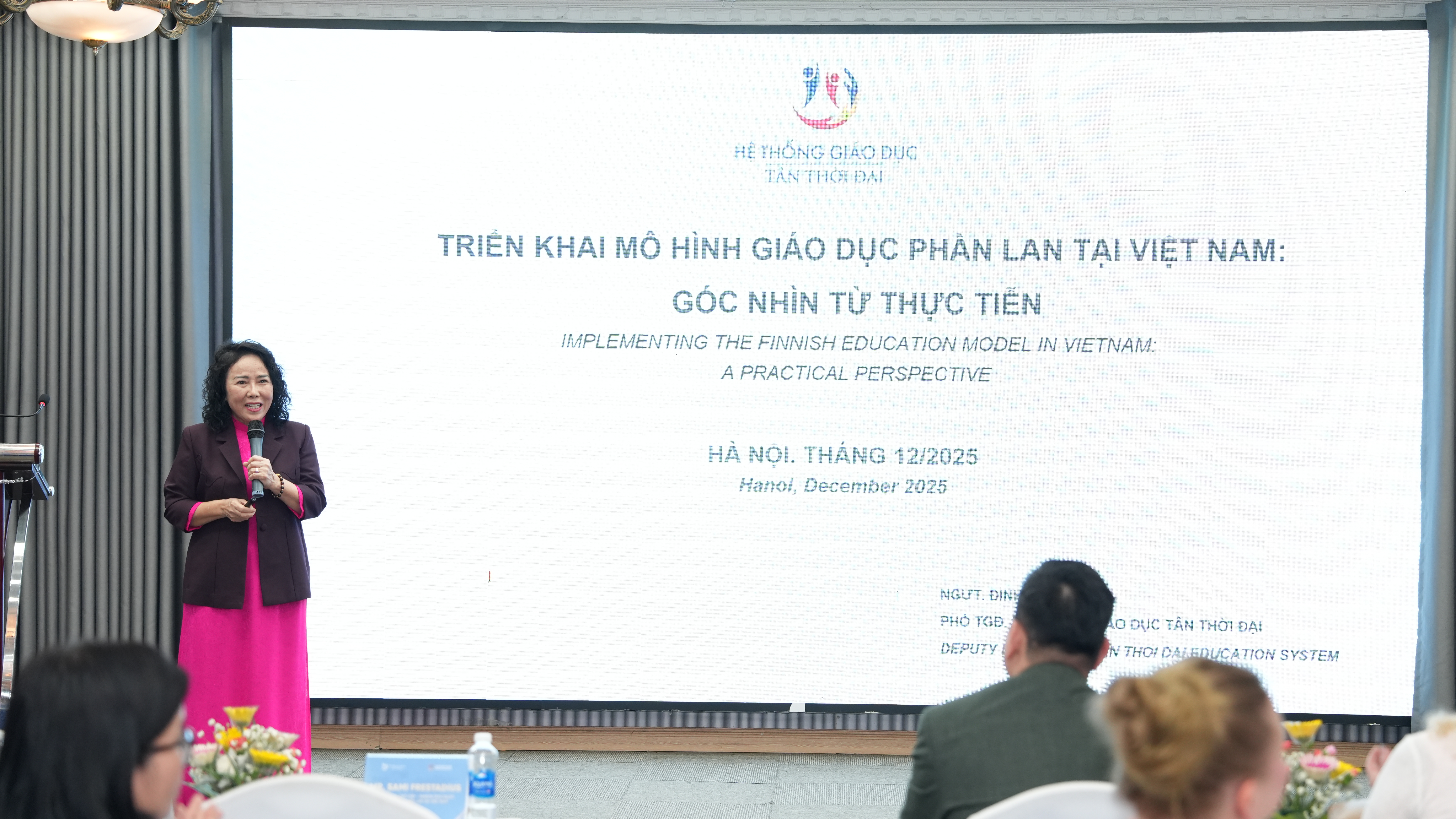 Nhà giáo Ưu tú Đinh Thị Tú – Đại diện Hệ thống Giáo dục Tân Thời Đại trình bày tham luận về triển khai mô hình giáo dục Phần Lan tại Việt Nam từ góc nhìn thực tiễn.