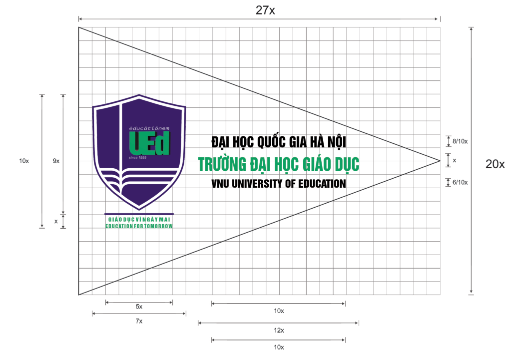 Cờ đuôi nheo có in toàn bộ cụm Logo của Trường Đại học Giáo dục. Kích thước, tỷ lệ, màu sắc của cụm Logo in trên cờ đuôi nheo đúng với quy định ở mục II. Vị trí đặt cụm Logo trên mặt cờ như trong hình dưới.
