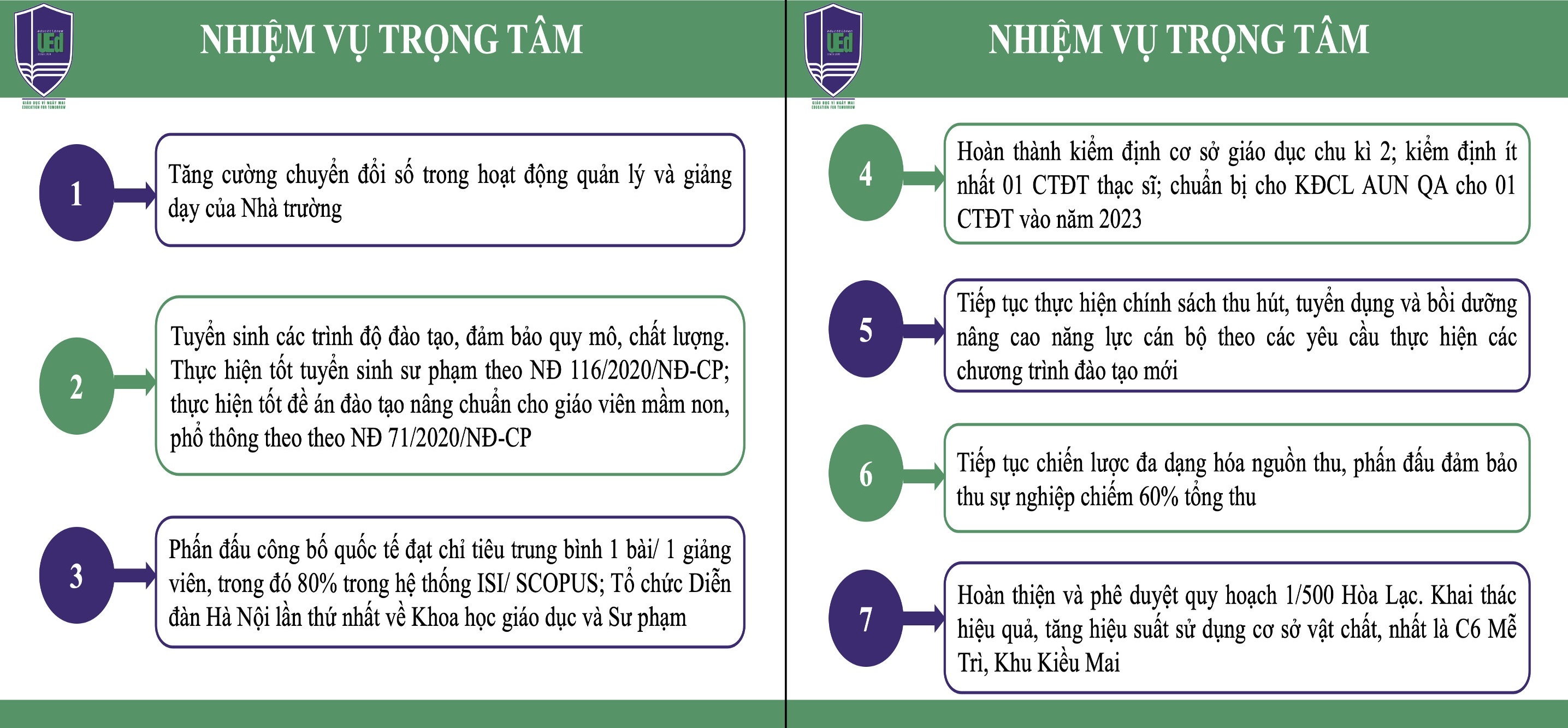 Trong năm học 2021-2022 tới đây, nhà trường tập trung đẩy mạnh các nhiệm vụ trọng tâm Phát triển các chương trình đào tạo thuộc lĩnh vực khoa học giáo dục để cân bằng với các ngành đào tạo giáo viên, đồng thời phát huy thế mạnh đa ngành, đa lĩnh vực trong ĐHQGHN. Trước mắt, chủ trương mở ngành Kế toán giáo dục/Kiểm toán trường học theo mô hình (A+B) cùng cấp bằng với Trường ĐH Kinh tế; điều chỉnh các chương trình đào tạo phù hợp với xu thế kiểm tra đánh giá theo tiêu chuẩn quốc tế; xây dựng Trường THPT Khoa học Giáo dục phù hợp với tình hình hiện tại và phương hướng phát triển trong thời gian tới cũng như kế hoạch thành lập Trường Phổ thông liên cấp; đầu tư phòng thực hành Giáo dục mầm non và Giáo dục tiểu học là các ngành mới của Trường; tiếp tục gia tăng chỉ số công bố, đặc biệt là công bố quốc tế đặt chỉ tiêu trung bình 1 bài/ 1 giảng viên trong đó có 80% là bài trong hệ thống ISI/ SCOPUS.