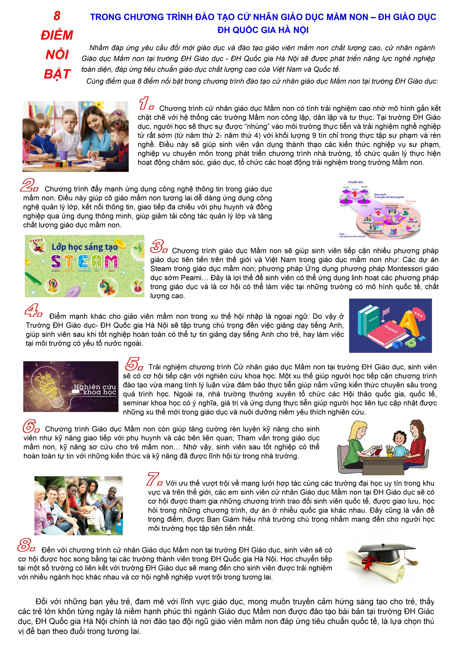 Nhằm đáp ứng yêu cầu đổi mới giáo dục về đào tạo giáo viên mầm non chất lượng cao, cử nhân ngành Giáo dục Mầm non tại trường ĐH Giáo dục – ĐH Quốc gia Hà Nội sẽ được phát triển năng lực nghề nghiệp toàn diện, đáp ứng tiêu chuẩn giáo dục chất lượng cao trong nước và quốc tế theo tám điểm nổi bật sau: