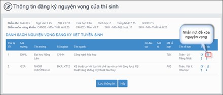 Nếu muốn xóa nguyện vọng: Ấn nút xóa trên màn hình hiện thị thông tin đăng ký nguyện vọng (biểu tượng thùng rác), sau đó ấn "OK"
