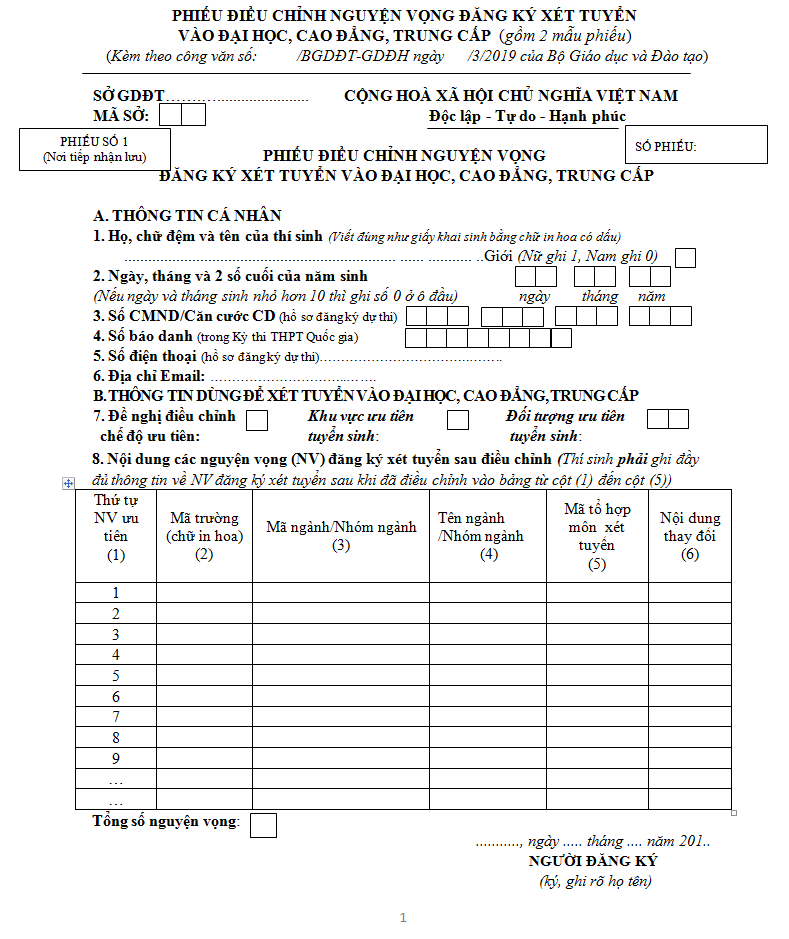 - Có hai mẫu phiếu điều chỉnh nguyện vọng giống nhau. Một phiếu thí sinh giữ sau khi được đóng dấu, một phiếu nơi tiếp nhận lưu.