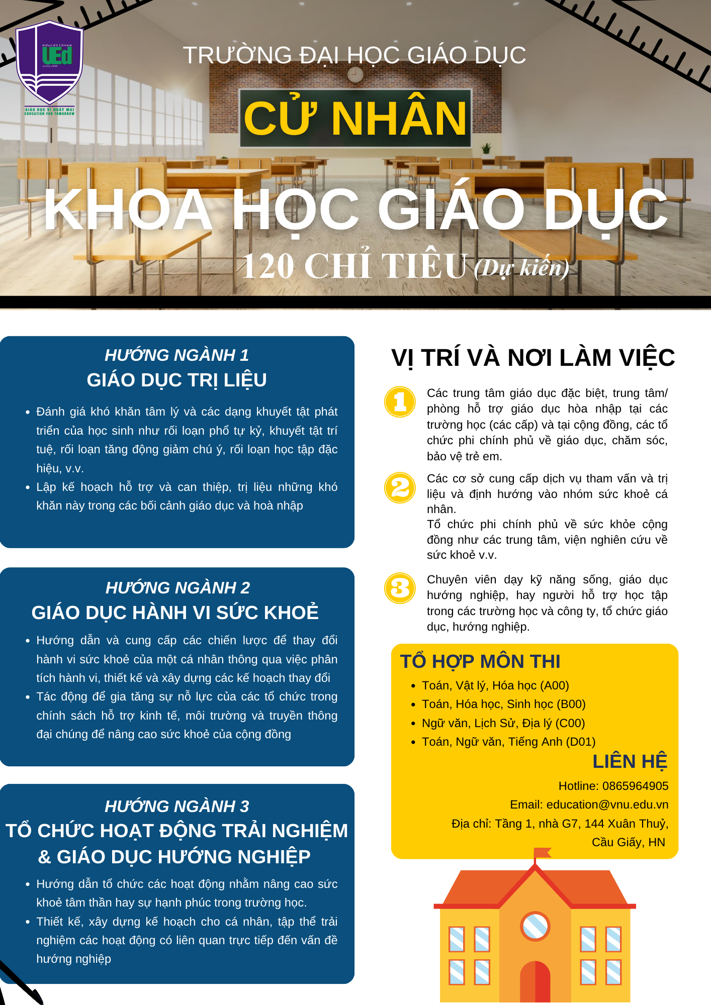 Năm 2023, Trường Đại học Giáo dục dự kiến tuyển sinh 1100 chỉ tiêu cho các nhóm ngành đào tạo sư phạm và ngoài sư phạm. Thông tin chi tiết: Tuyển sinh đại học chính quy năm 2023 Tổng hợp thông tin tuyển sinh đại học chính quy của Trường Đại học Giáo dục – ĐHQGHN liên tục được cập nhật theo đường link: Tuyển sinh đại học chính quy Mọi thắc mắc, hỗ trợ, thí sinh liên lạc theo địa chỉ: Trường Đại học Giáo dục – Đại học Quốc gia Hà Nội Địa chỉ: Nhà G7, số 144 Xuân Thuỷ, Cầu Giấy, Hà Nội Website: http://education.vnu.edu.vn/ Fanpage: https://www.facebook.com/education.vnu.edu.vn Hotline tuyển sinh: 0865964905 hoặc (024) 7301 7123 – máy lẻ 1102 (trong giờ hành chính) |