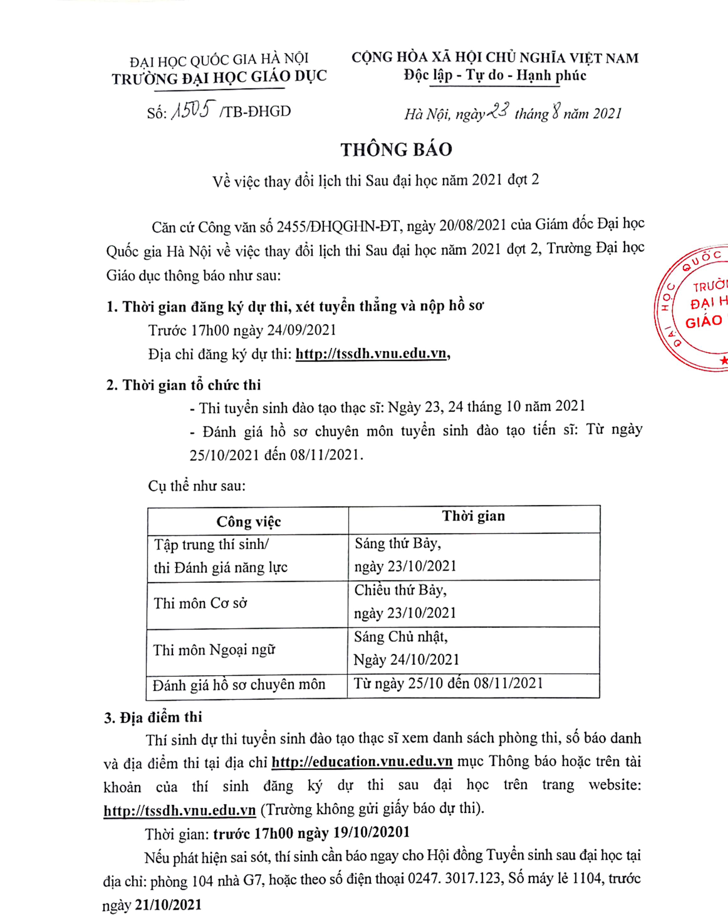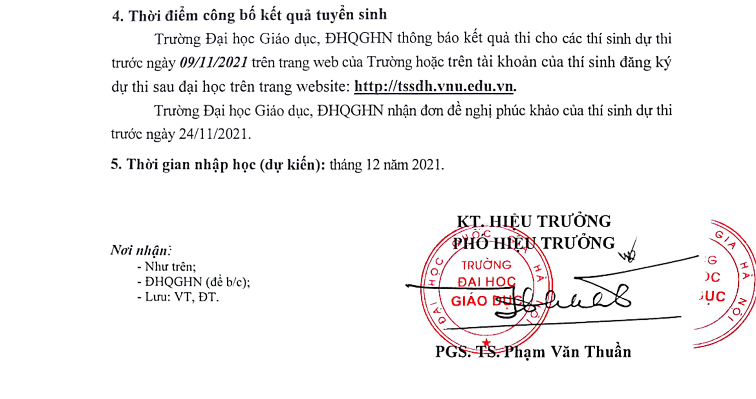 Căn cứ Công văn số 2455/ĐHQGHN-ĐT, ngày 22/08/2021 của Giám đốc Đại học Quốc gia Hà Nội về việc thay đổi lịch thi Sau đại học năm 2021 đợt 2, Trường Đại học Giáo dục thông báo: