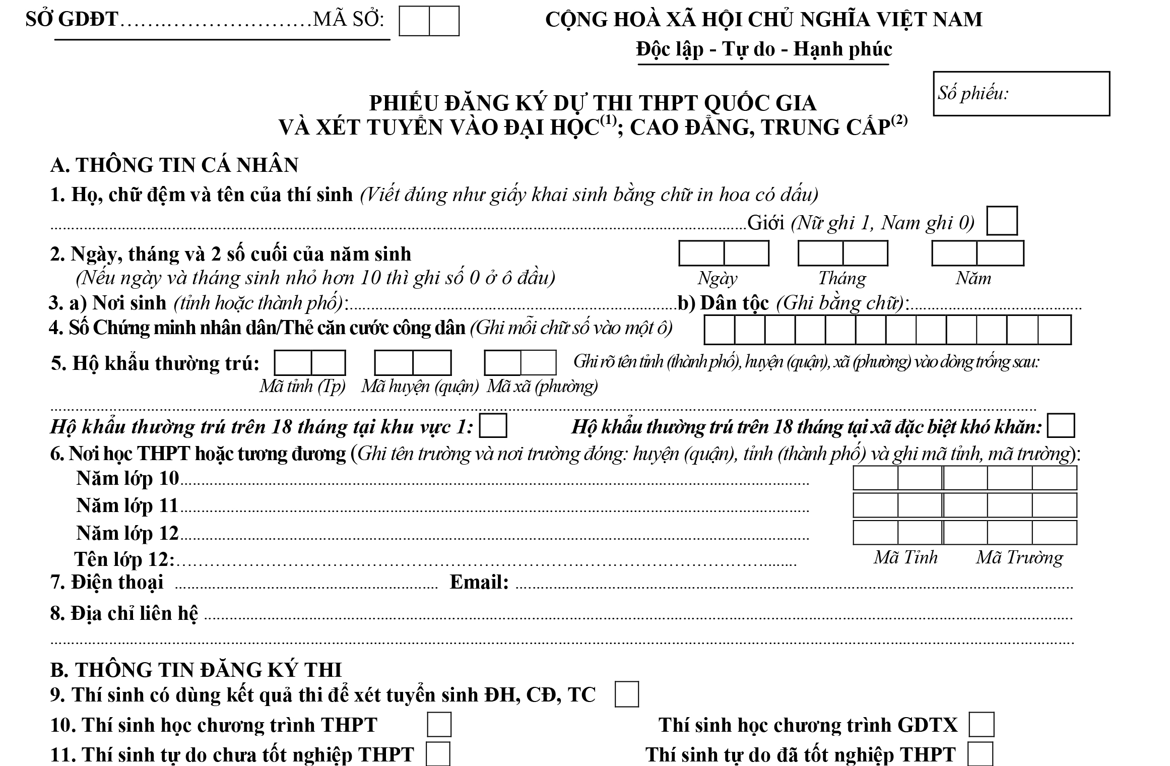 - Mục tên lớp 12: Ghi rõ tên lớp 12 đang học (Ví dụ: 12A1, 12A2,...), đối với thí sinh tự do ghi “TDO”.