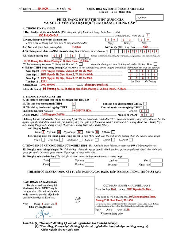 Cuối cùng, để hoàn tất thí sinh cần ghi rõ ngày tháng năm làm hồ sơ, ký tên, dán ảnh 4x6 có xác nhận của trường (nếu đang là học sinh, sinh viên) hoặc xác nhận của Công an xã/phường (đối với thí sinh tự do đang cư trú tại địa phương).